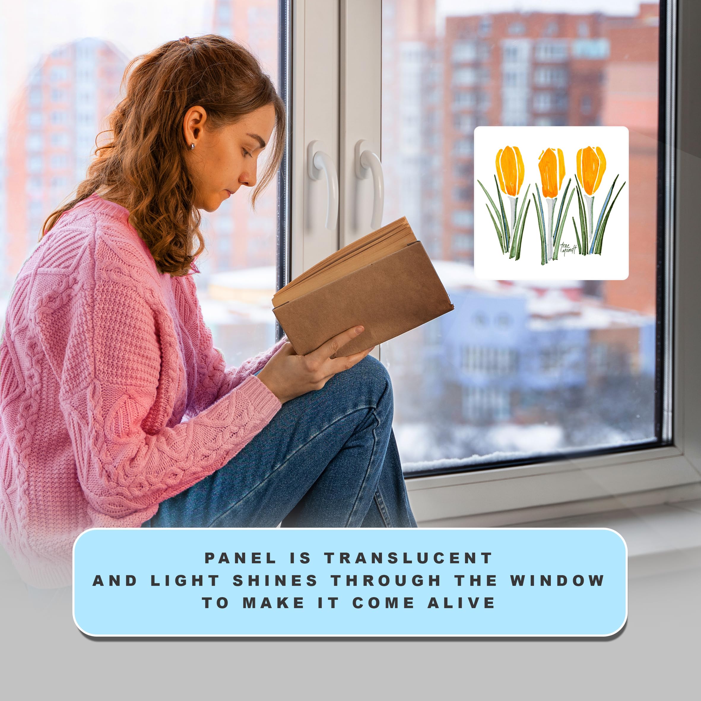 Bursting with color, the sunlight streams through each Panel generating explosive imagery throughout your room. Just place it near a window or stick it on with the suction cups provided, and watch the sunlight bring it to life. Our standard size of Sunlight Art® Panels is 11×11”, however, you can order any Panel in a custom size – 8×8”,15×15” or larger – on the site here. Each Sunlight Art® mixed-media image is printed exclusively on transparent panels.