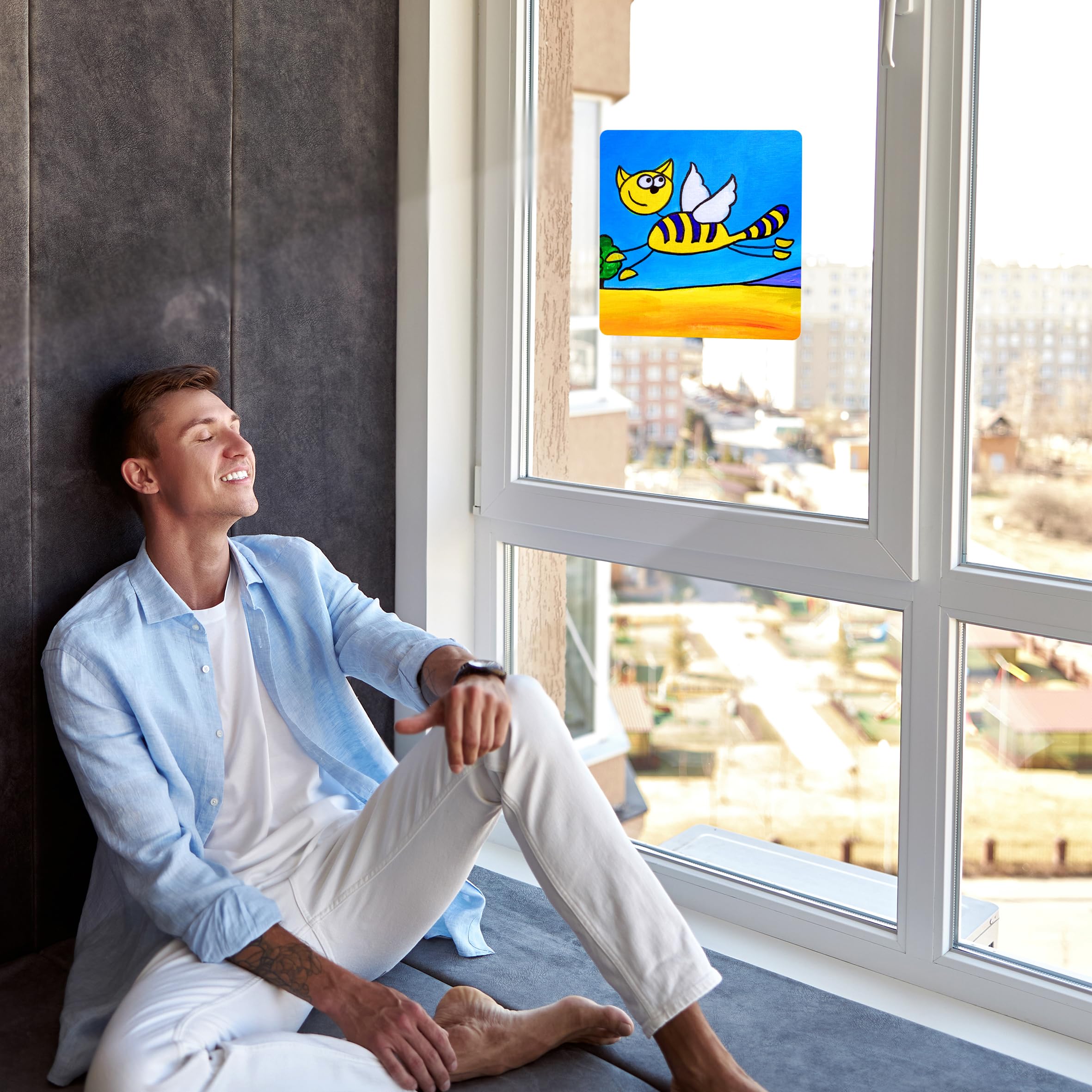 Bursting with color, the sunlight streams through each Panel generating explosive imagery throughout your room. Just place it near a window or stick it on with the suction cups provided, and watch the sunlight bring it to life. Our standard size of Sunlight Art® Panels is 11×11”, however, you can order any Panel in a custom size – 8×8”,15×15” or larger – on the site here. Each Sunlight Art® mixed-media image is printed exclusively on transparent panels.