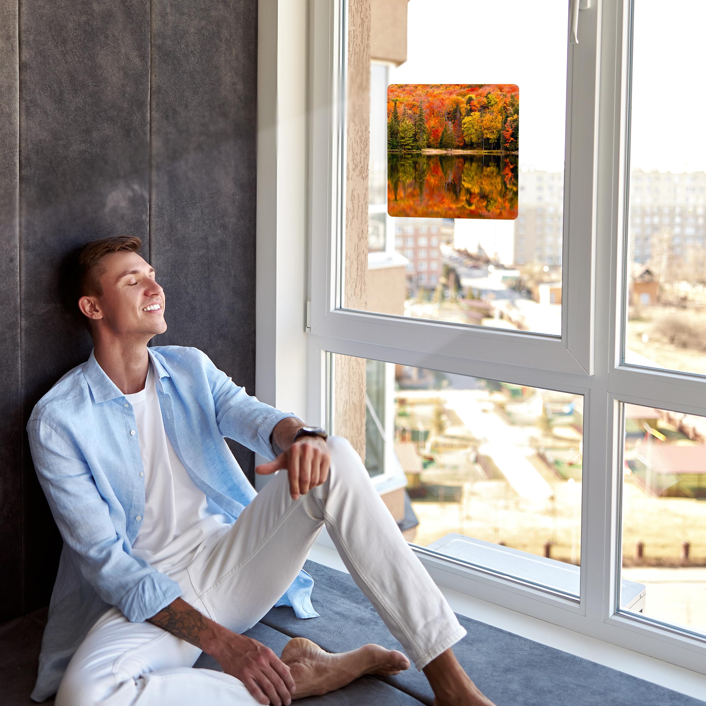 Bursting with color, the sunlight streams through each Panel generating explosive imagery throughout your room. Just place it near a window or stick it on with the suction cups provided, and watch the sunlight bring it to life. Our standard size of Sunlight Art® Panels is 11×11”, however, you can order any Panel in a custom size – 8×8”,15×15” or larger – on the site here. Each Sunlight Art® mixed-media image is printed exclusively on transparent panels.
